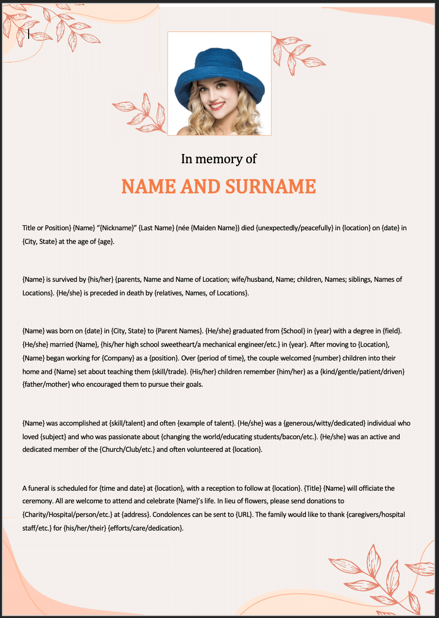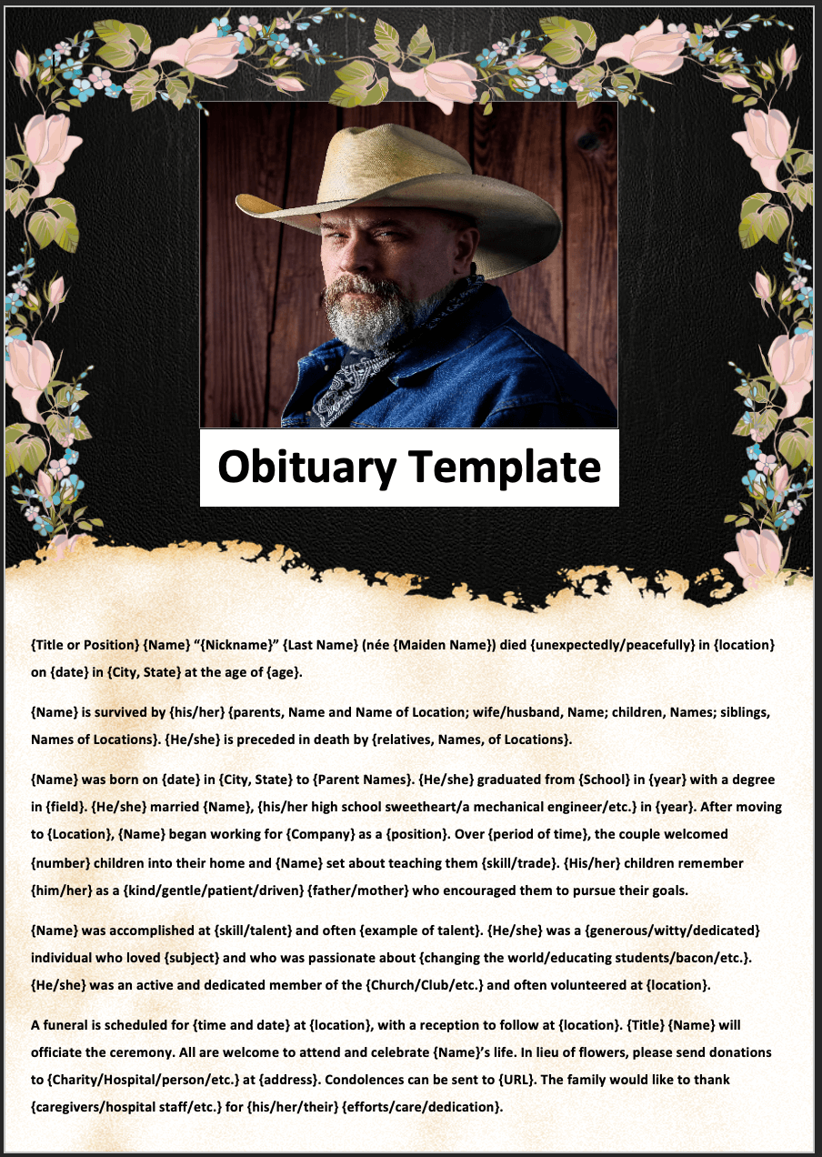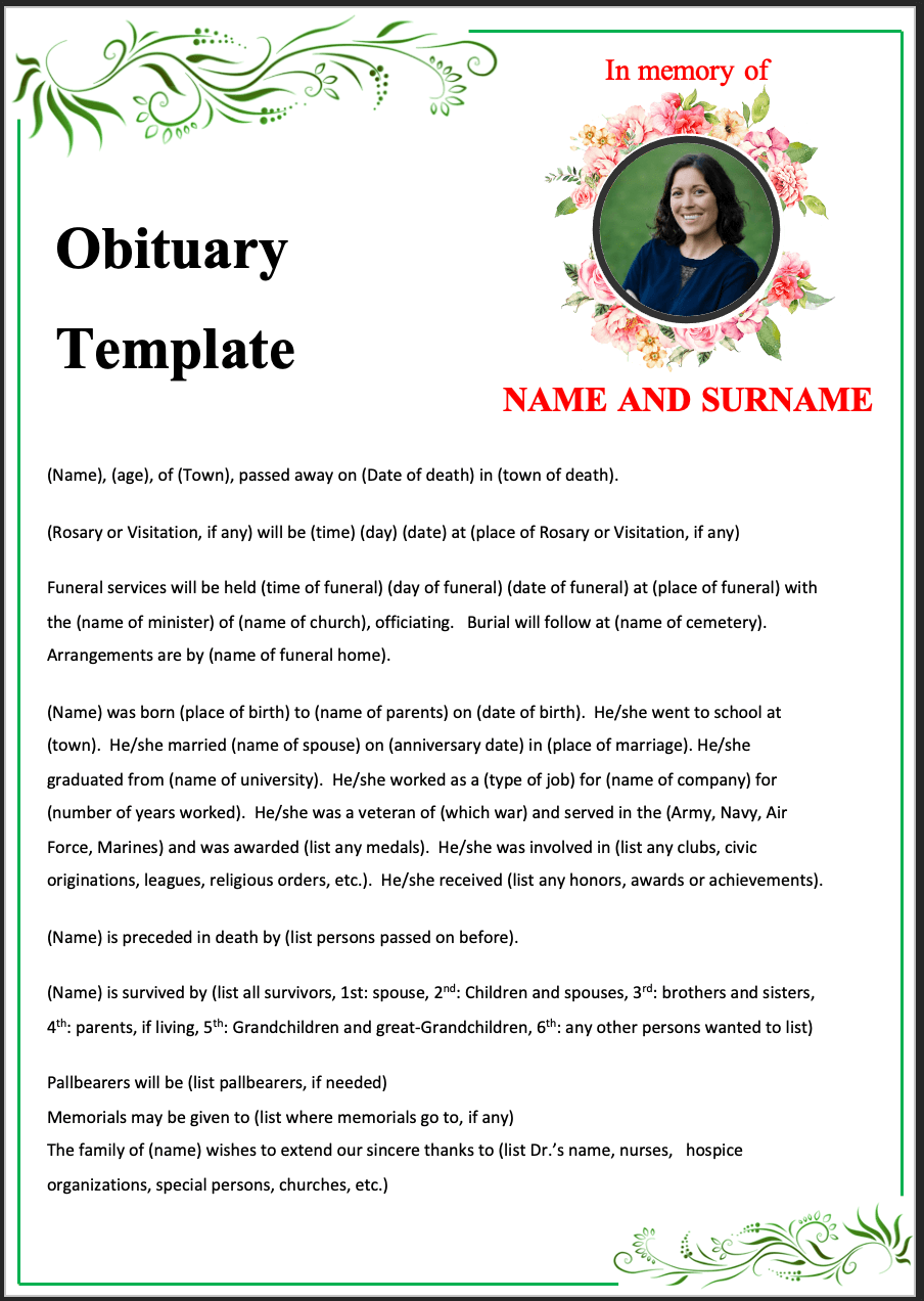 An obituary template is a structured format or outline used to write an obituary, which is a notice or announcement of a person's death, typically including a brief biography and details about funeral arrangements. The template provides a framework to ensure that important information is included and presented in a clear and respectful manner. It typically includes sections such as: