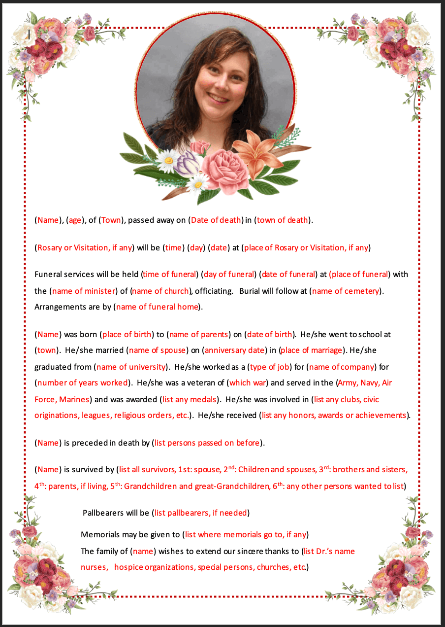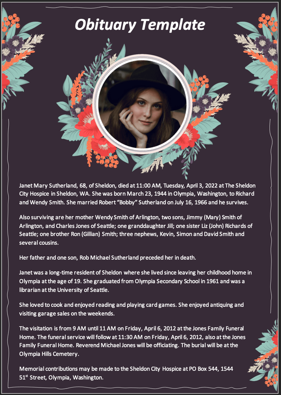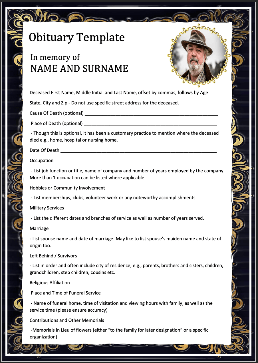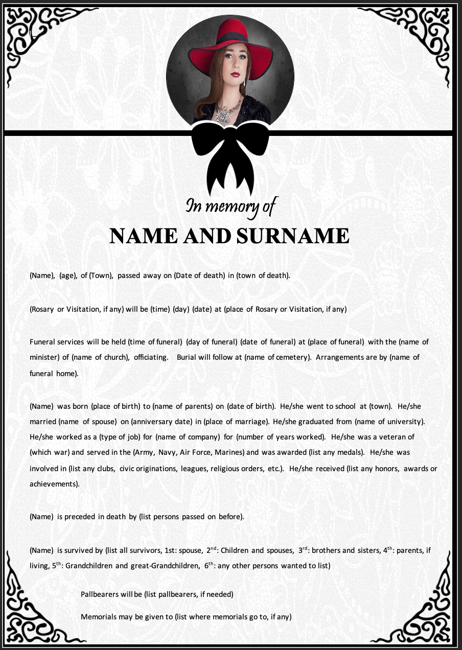 While the specific format may vary depending on cultural customs and personal preferences, these are common elements found in many obituary templates. They provide a helpful guide for writing an obituary that accurately reflects the life of the deceased and provides important information for friends, family, and community members.